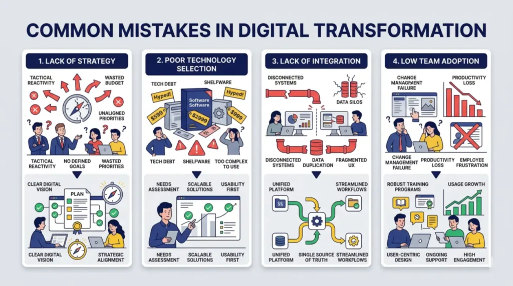 While digital transformation offers significant benefits, many businesses fail to achieve the desired results due to poor planning, incorrect technology choices, or lack of execution clarity. Avoiding these common mistakes can save time, reduce costs, and ensure a smoother transformation journey.
